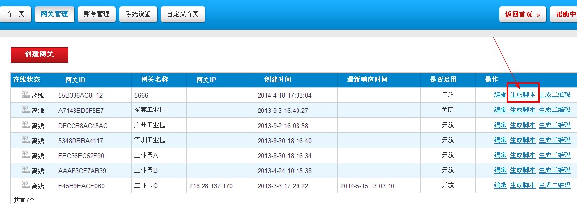 访问联合无线官方网站(http://wifi.u7pk.com) 用通行证登陆管理后台,在"网关管理"中选择使用的网关ID, 点"生成脚本"
